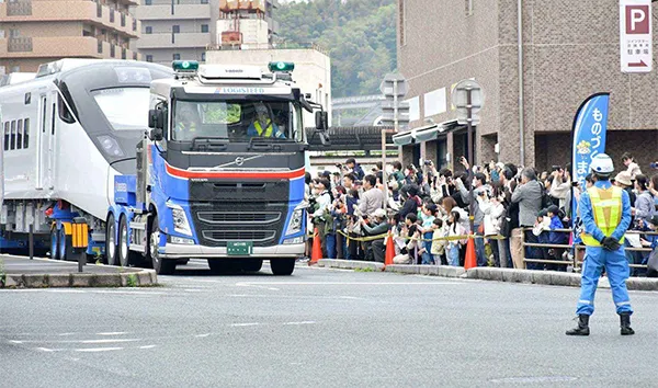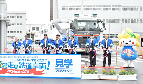 The project was carried out by transporting railway cars during the day-time, which is usually done at the night-time due to less traffic. It is for appealing nationwide the city as a "manufacturing town, Kudamatsu" where railway-related companies gather. This event was held for the third time in five years since 2019, and approximately 50,000 people including railway fans and families gathered along the street. The event began where the start ceremony held in front of the main gate of Kasado Works, Hitachi, Ltd. The cars were EMU3000, intercity express which will be used in Taiwan. LOGISTEED West Japan, Ltd. loaded the two leading cars onto the trailers and transported them approximately 3.3 km round trip between Kasado Works and the Kudamatsu Station.