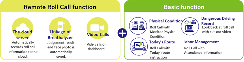 "Roll Call" is legally mandated to ensure the safety of drivers and must be implemented by all motor truck transportation business operators. MLIT is promoting the DX of operation management work with the aim of correcting labor shortages and long working hours in the logistics industry in recent years, and improving work efficiency. As one of these initiatives, "Remote Roll Call" is permitted only when certain criteria are met. Remote Roll Call is a Roll Call method that allows the operation manager and driver to conduct Roll Calls remotely using IT equipment, which would otherwise need to be conducted face-to-face.3. About Remote Roll Call Function of SSCV-Safety