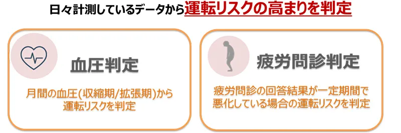 - 1ヵ月以上蓄積された血圧値、疲労問診の結果を用いて、運転リスクの高まりを判定します(※2)