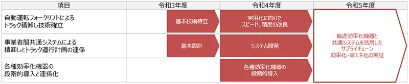 本事業は令和3年度から令和5年度まで(2021年9月~2024年3月)の複数年度の計画で、段階的に物流効率化機器の導入と技術検証、事業者間を横断する情報システムの開発・検証を実施しました。