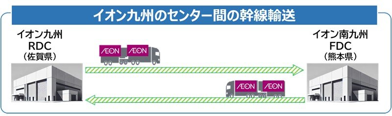 現在、イオン九州RDC(佐賀県)とイオン南九州FDC(熊本県)の間では、大型トラックを使用していますが、今回一部をダブル連結トラックに切り替えることで、大型トラック2台分を1台で輸送できるため、ドライバーの省人効果として50%※、CO2排出量は約40%※の削減が見込まれます。※NLJ調べ